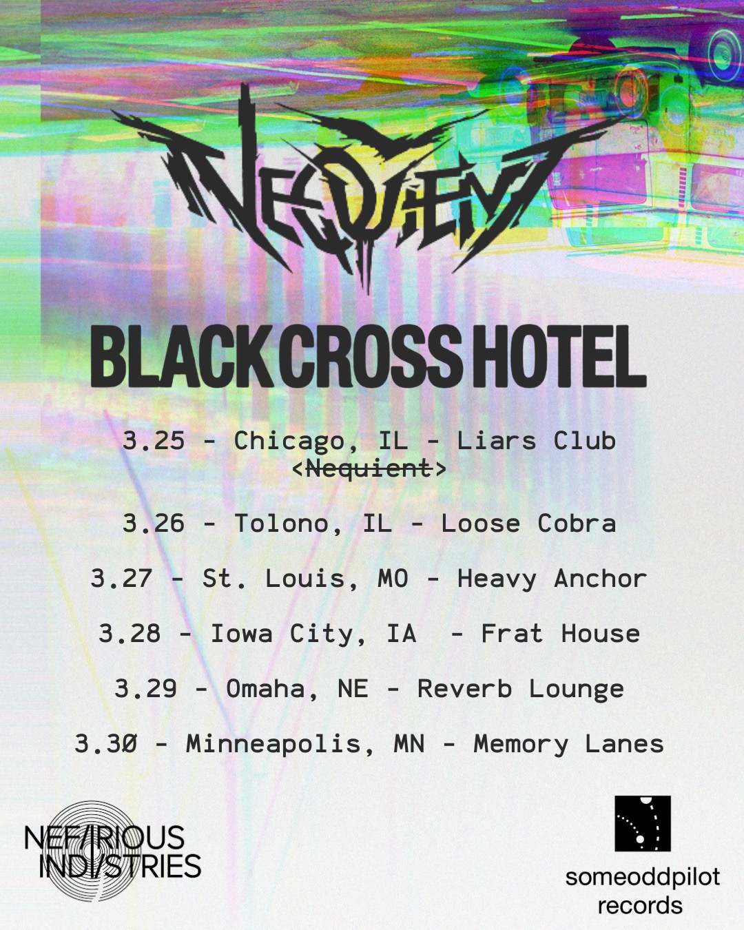 NEQUIENT is booking tour dates surrounding the album’s release, having already announced a run of Midwest dates with Black Cross Hotel March 26th through 29th, and a hometown release show on the day of the album’s release. A Summer East Coast tour and more is also in the works.